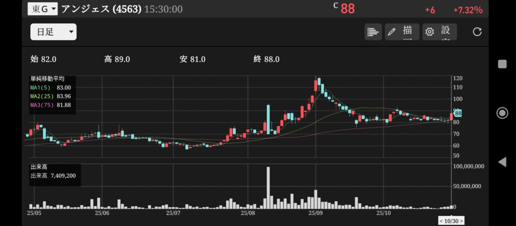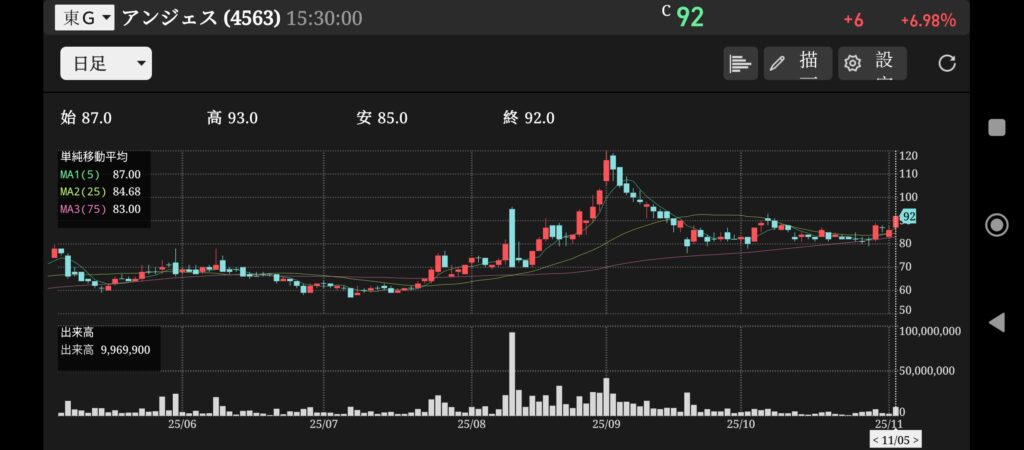 大きな出来高を伴ってはいませんが、上昇の勢いはあるようです。