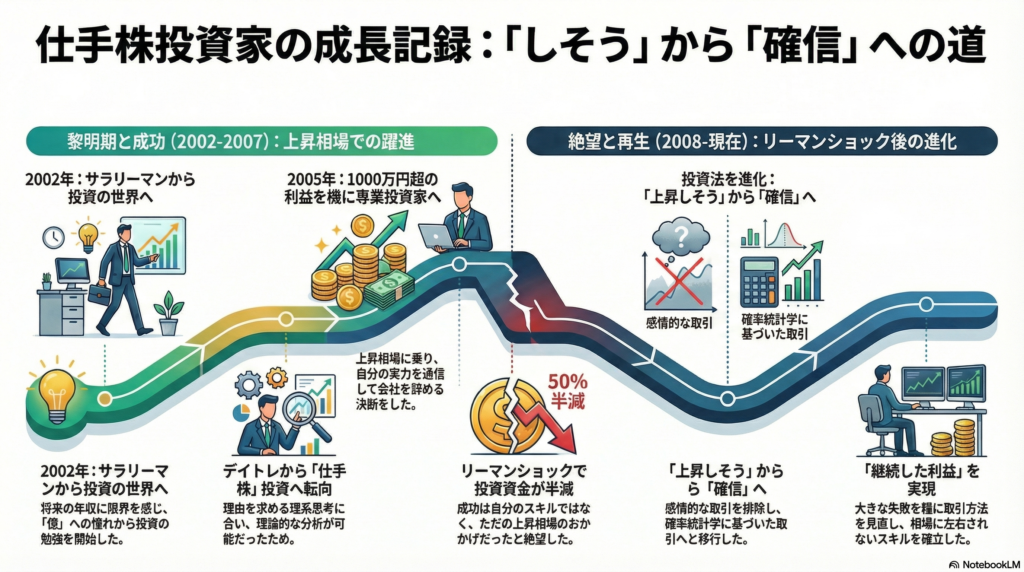 リーマンショックのおかげで自分の取引方法を一から見直すことができその結果、確信を追い求めた株式投資法が完成しました。